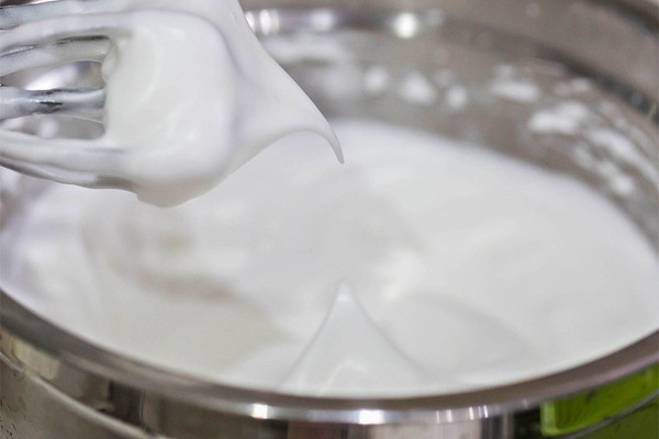 打出淡纹路后,加入剩下的细砂糖,打发至鹰嘴状的大弯钩;