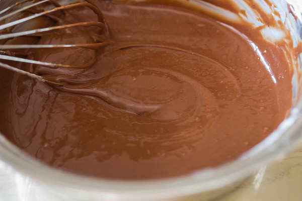 巧克力豆+可可粉+玉米油+盐,加热搅拌至巧克力融化;