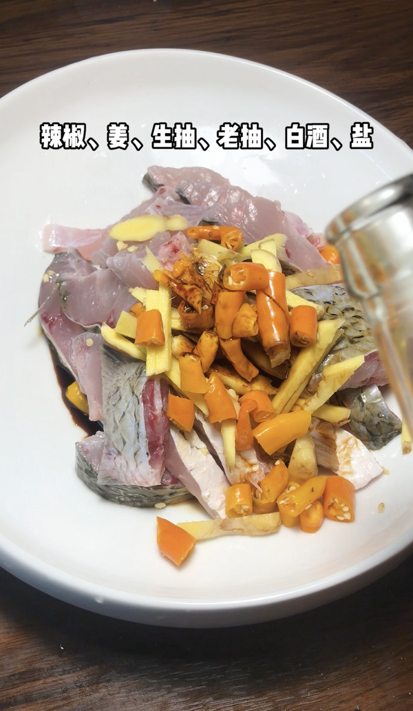 洗好的草鱼切块,放入小米辣、姜丝、生抽、老抽、盐、白酒腌制