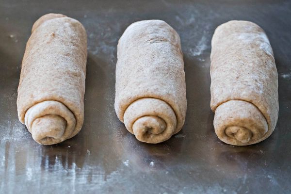 把面团均分成三份,稍微整理一下成圆柱形,分别擀成约30cm长的面片,然后卷起来;
