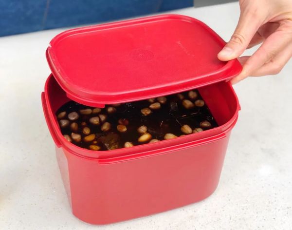 特百惠腌泡盒倒入花生、80克云南老冰糖、2瓶乳酸菌老陈醋基本没过、15克芝麻油,具体的量根据个人口味增减(酸醇柔和,选自正宗山西老陈醋,呈味肽技术,能提升营养吸收度,呵护肠胃健康);
