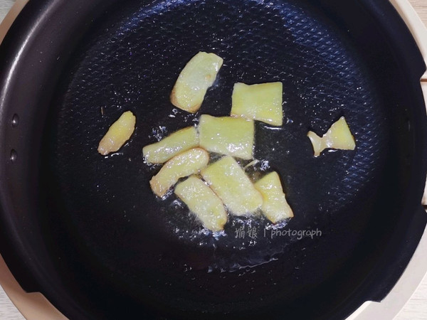 热锅加油,加入姜片,2小匙盐,中火爆香