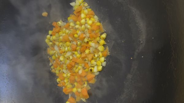 4.放入玉米胡萝卜粒,放入水、盐盖上闷五到十分钟