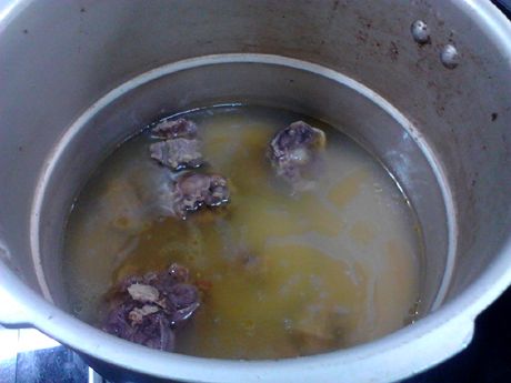 浮沫捞尽后,盖上盖子,放好限压阀,大火煮至上压后,转中火继续煮约35-40分钟后,熄火。