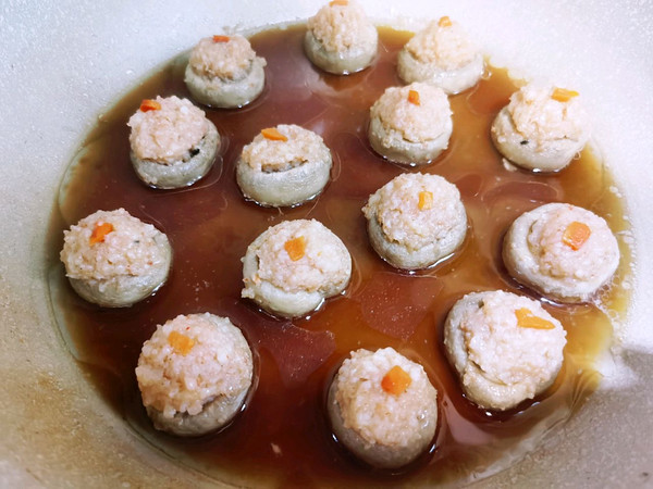 锅里放底油后摆入做好的虾滑蘑菇,小火微煎