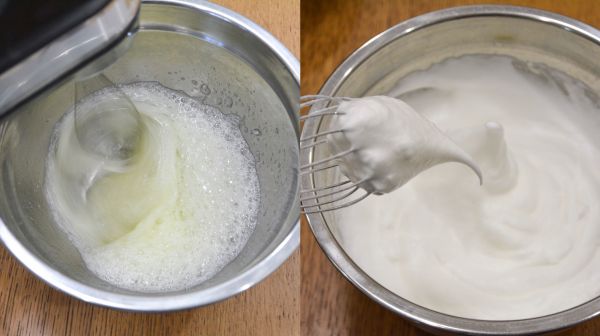 蛋清用电动打蛋器高速打出粗泡,细砂糖分3次加入蛋白中:打出粗泡、打出细腻白色发泡、打出有纹路的细腻白色发泡;第三次加糖后转中速搅打;蛋白糊出现瓷器质感并有明显纹路时提起打蛋器,蛋白糊呈大弯钩