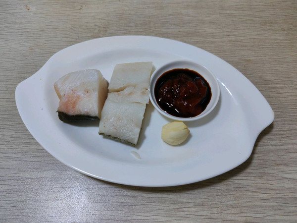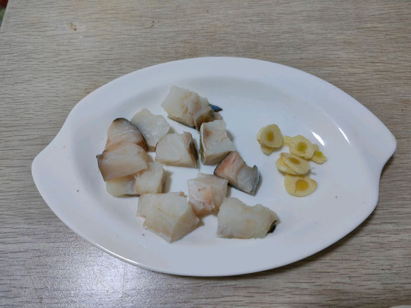 冷冻鳕鱼取出2小块自然解冻,剥好一个蒜瓣。