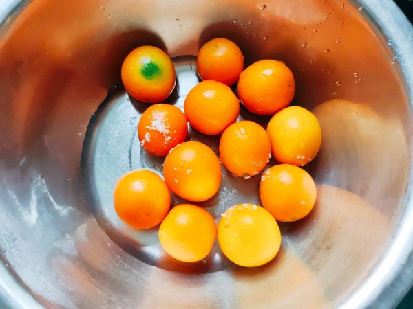 姐金桔放盆里,放一勺盐,一点点水,把金桔揉搓一会儿,然后洗净
