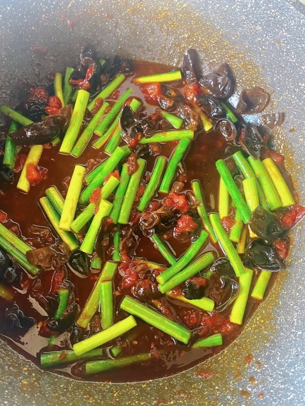 热锅凉油,放入西红柿丁、一点盐炒出汤汁;