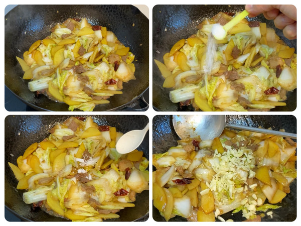 下入白菜片 翻炒 白菜炒塌 淋入2汤勺生抽 1汤勺蚝油 1汤勺鲜鸡汁 翻炒至调料融合