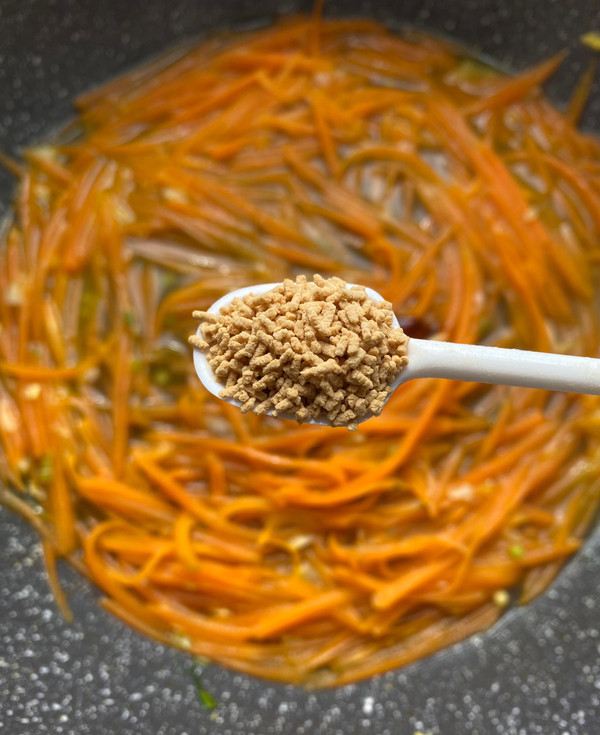 加入胡萝卜丝翻炒均匀,加适量清水盖盖焖煮至胡萝卜变软,加适量生抽调味