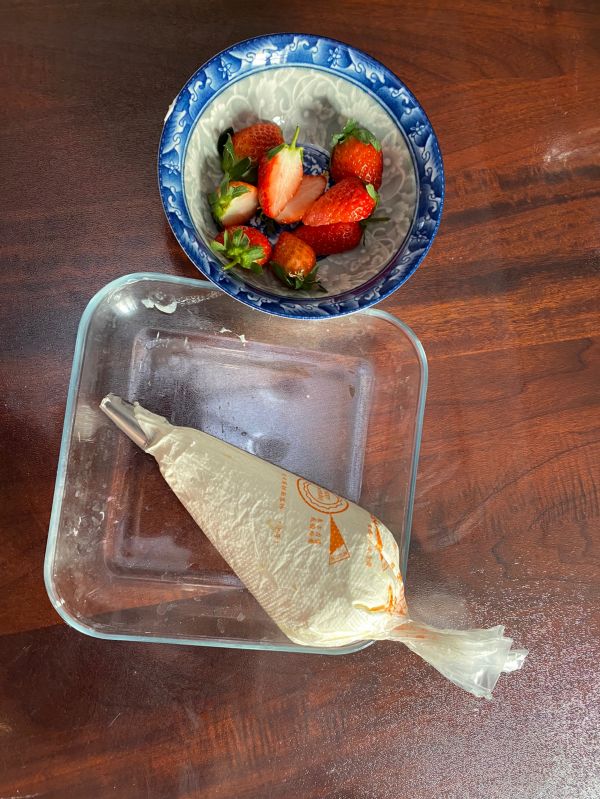 装入裱花袋,再准备几个草莓切开备用。