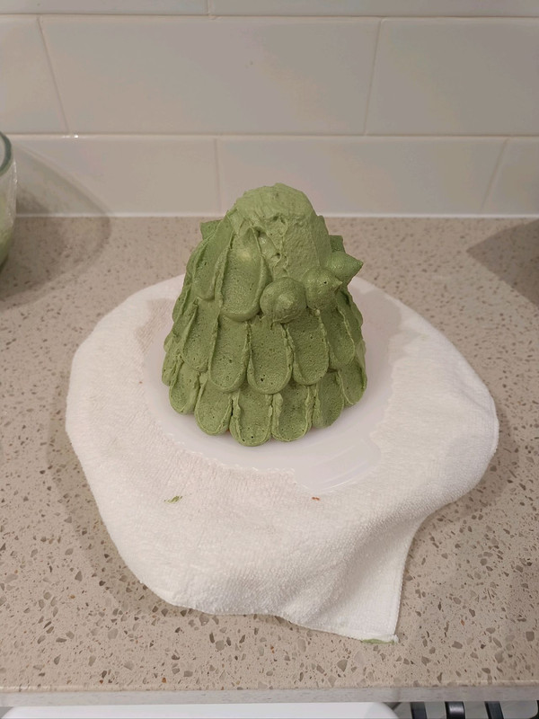 把抹面奶油都放到裱花袋里,用1A裱花嘴做花纹,挤出一个个小球,然后用刮刀往上推,一层一层做