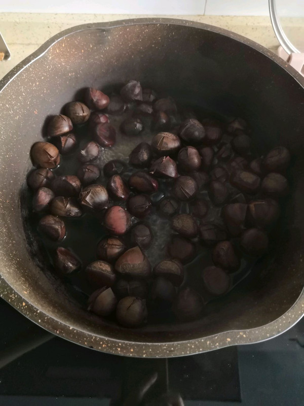 开始炒了,中间也可以时不时的掂起锅晃动锅里的栗子进行炒