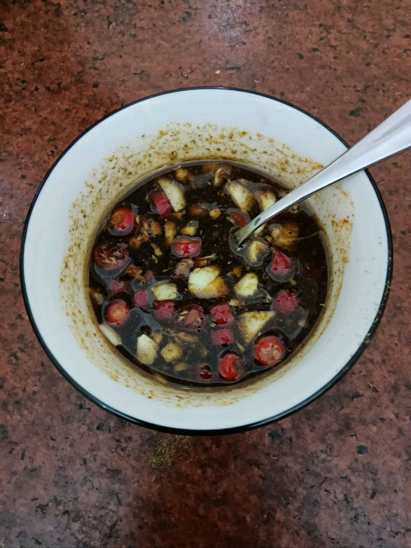 碗里加入蒜末、小米辣,倒入一勺食用油,两勺生抽,一勺蚝油,半勺孜然粉,半勺辣椒粉,半勺花椒粉