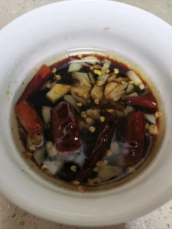 小碗里放蒜末,干辣椒,香葱碎,蔬之鲜,锅里烧一些热油,浇到碗里
