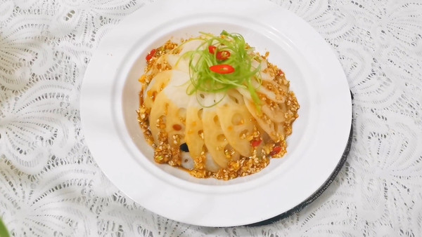 藕片上点缀葱丝,吃的时候淋上料汁就可以啦