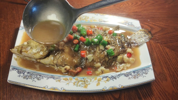出锅装盘,最后淋入汤汁儿
