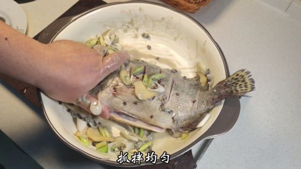 放入鳜鱼,加适量食盐、味精、生抽、白胡椒、陈醋、白糖调味