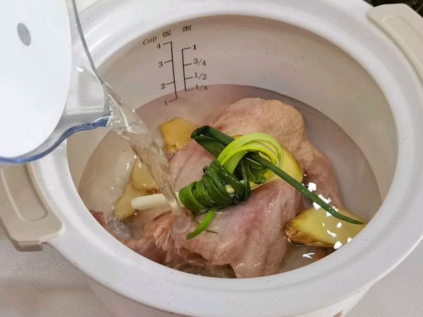 食材都准备好了,把鸽子放进陶瓷电饭锅里,加入生姜片和香葱结,再倒入1勺料酒和适量清水。