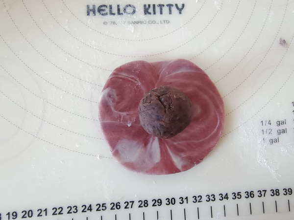 11、包上红豆馅,收紧封口,压扁,直径约9厘米。
