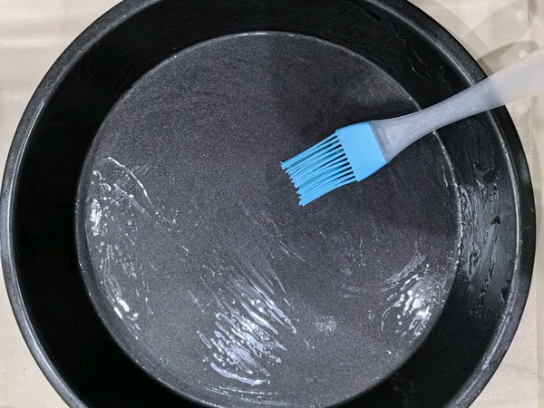 八寸的披萨盘上倒入一点油,这个主要是方便稍后脱模。