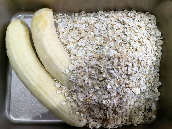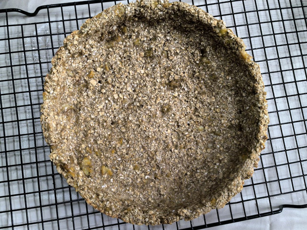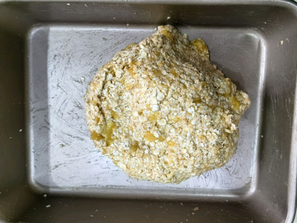 继续戴着手套,把刚刚搅拌好的香蕉麦片泥均匀的铺在披萨盘中。