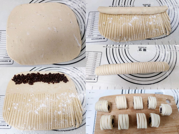 擀成面片,上面放上蜜豆,从中间往下面抹油撒面粉(底部留一圈不抹油),用刮刀切成条状。 从上面卷起来(把蜜豆卷紧实,防止散开),底部压薄,接口朝下,搓光滑,剁成大小均匀的剂子。