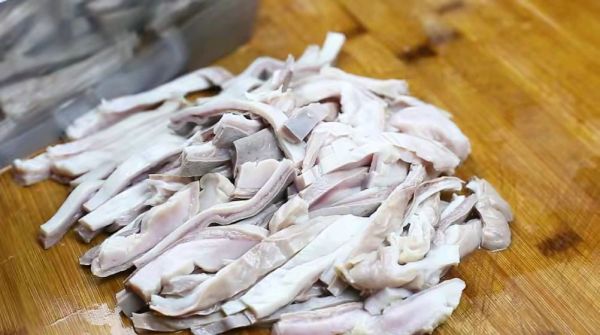 然后改刀切成条,切的稍微均匀一点,但是大家一定要记住,这个猪肚是生的,不是煮熟的,只是过了水,颜色看上去有点像熟的一样。