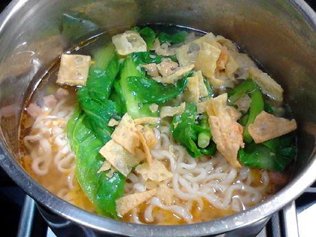 再依次将煮好的方便面,白菜苔,腐竹包中的腐竹倒入锅中,搅拌均匀,熄火。
