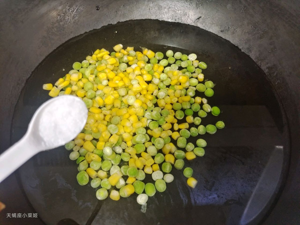 将准备好的玉米粒和青豆然入锅中放水(水中加入少许食盐和几滴食用油)