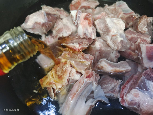 将排骨红糖一同倒入高压锅中(汤汁不要过多,和平时蒸米饭的水差不多就可以)