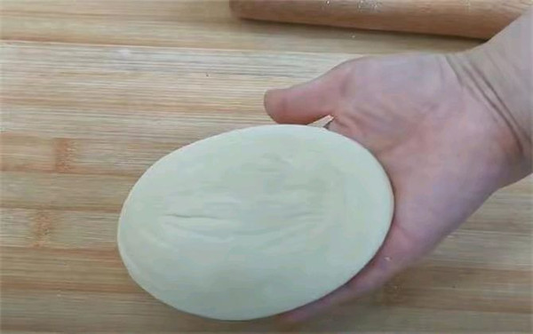 再把它展开,切面朝上,先用手按压平整,再用擀面杖擀成椭圆形的小饼,像这样一个饼胚就做好了。