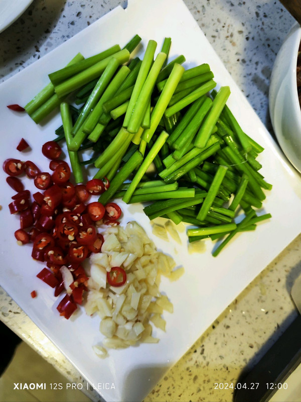 吃荤菜一定要放点素,放了一点韭菜苔很好吃。小米椒,蒜瓣,韭菜苔切好。