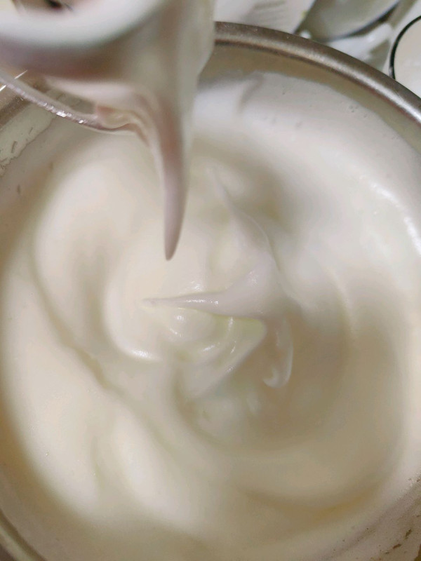 蛋白分三次加入剩下的30克糖用电动打蛋器打至九分发,提起有大弯勾即可。