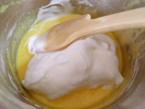 将蛋白分三次加入蛋黄糊中翻拌均匀。
