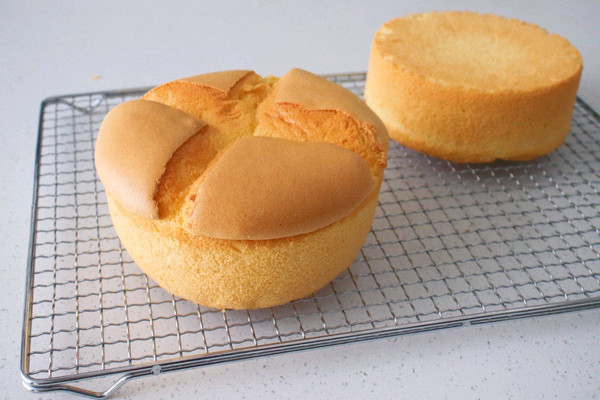 蛋糕出炉后,轻震两下模具震出大气泡,然后立即倒扣让它冷却,等到冷却再脱膜。