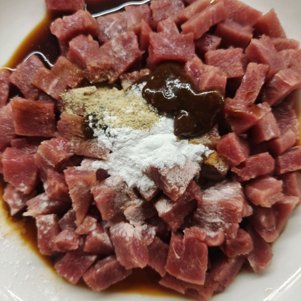 洗好的牛排切成丁备用。