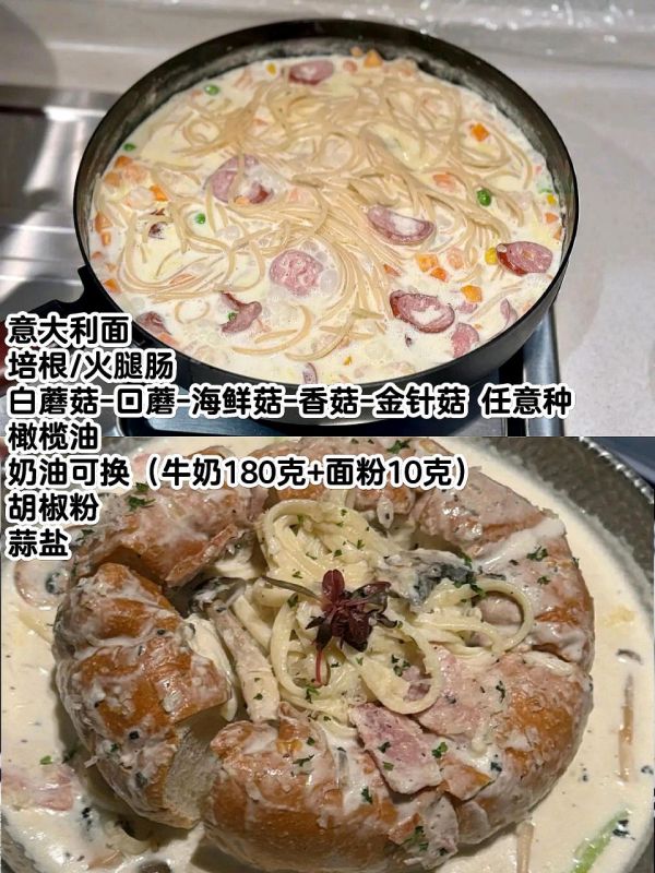 牛奶面糊先搅和开  ➕蘑菇炒熟➕意面煮熟过凉水备用  ➕其余食材一股脑全倒进锅里边小火煮到粘稠