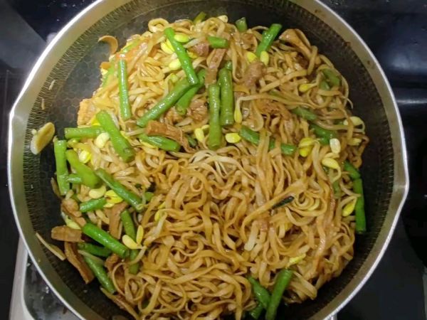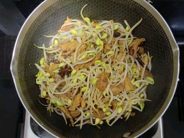 第四步:先倒入黄豆芽翻炒三四分钟,再放入豆角翻炒两三分钟,放入食盐、十三香、味精、生抽调味,倒入适量热水,颜色不够深可以在适量加入老抽上色。