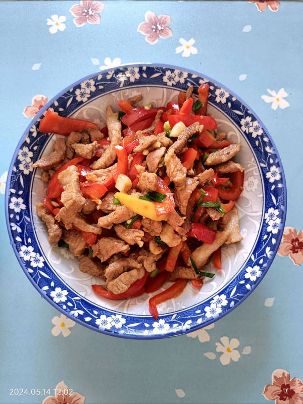 把肉,红辣椒切成条,我用的是大红椒,不辣的,甜中带点酸