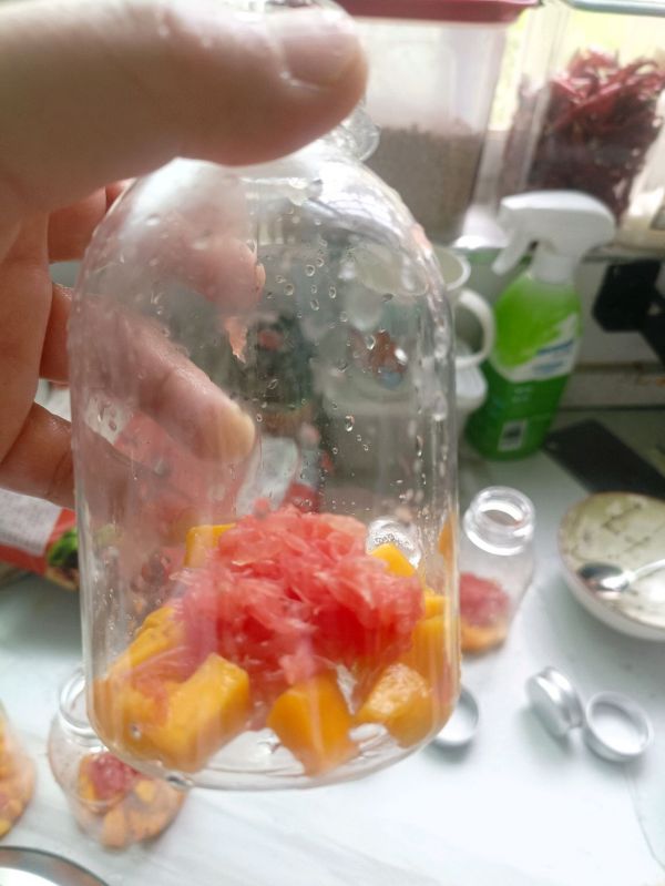 开始装瓶(装瓶顺序依次是芒果丁 西柚果肉 西米 少许牛奶 最后倒入打好的果泥)