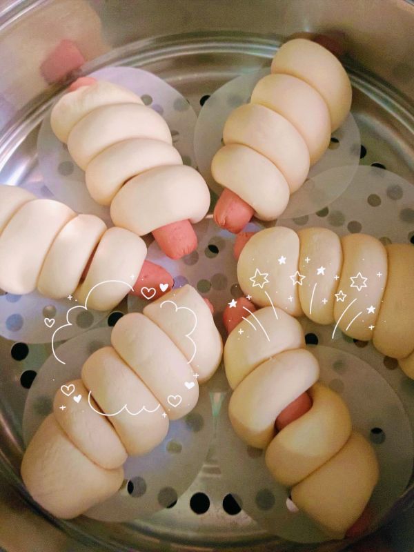 把火腿肠提前剥皮。 无需发酵,面团直接在面垫上揉匀,分成六等份儿。 面团搓成长条,在火腿肠上缠绕三四圈儿包裹住火腿肠就可以了。