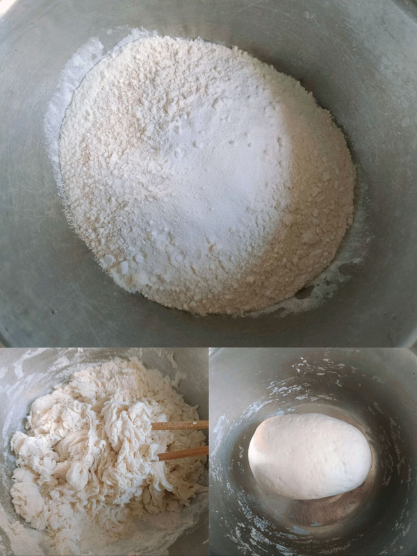 盆中加入面粉、太古绵白糖,更容易化开,酵母粉,加入温水搅拌成棉絮状,手揉至光滑即可。