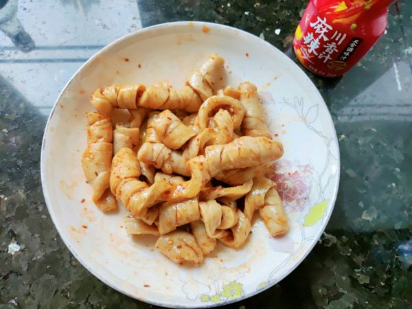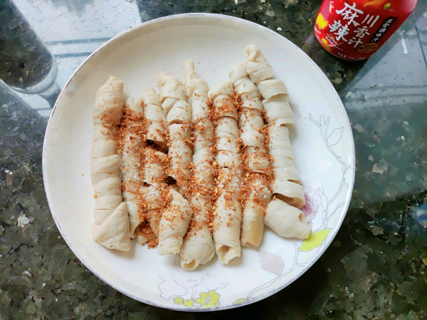 面筋用小刀转着切一下,可以连着筷子,这样方便一点,放一勺烧烤料