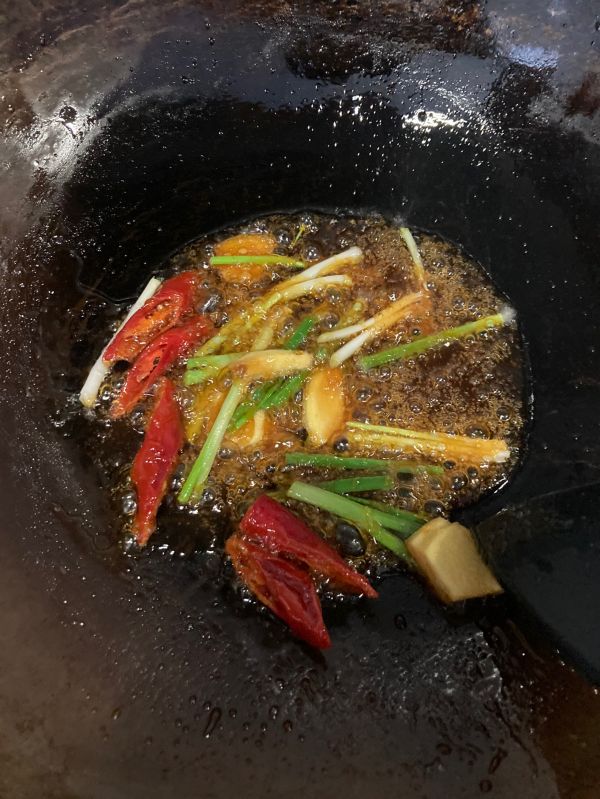 倒入姜、葱、辣椒如果没有现成卤包,可以自行调配干料(草果1个、桂皮1块、大料1个、香叶2片、丁香1个、花椒粒适量)可在此步放入锅中油炸出香味,如果有现成卤味包就不用放。
