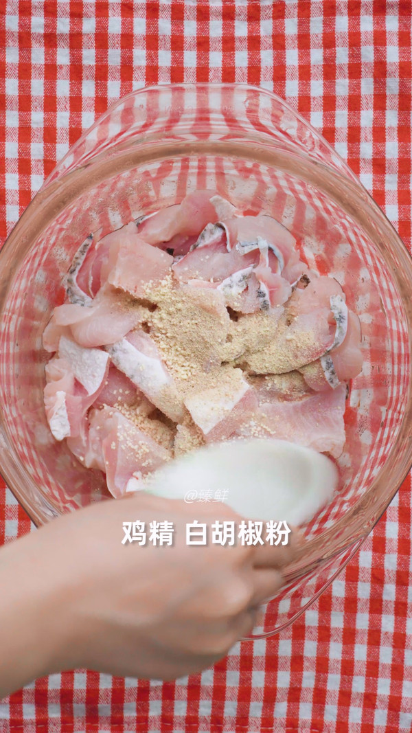洗好的鱼片放入盐 鸡精 白胡椒粉 再加入适量葱姜水 顺着一个方向抓拌至水分吸干