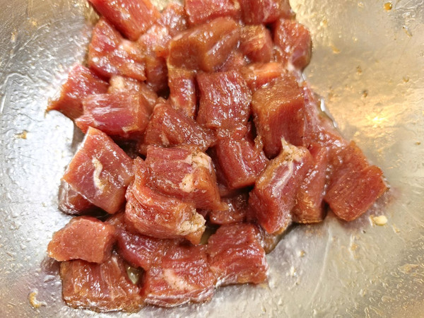 牛里脊切2厘米方的小块,加料酒、1勺黑胡椒粉、淀粉、1勺生抽抓匀,腌制10分钟。