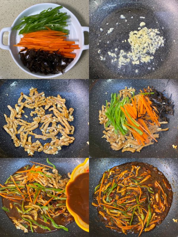 3⃣️油热蒜末爆香,放里脊肉翻炒变色,放胡萝卜丝、青椒丝、木耳丝翻炒均匀,淋酱汁翻炒至浓稠即可