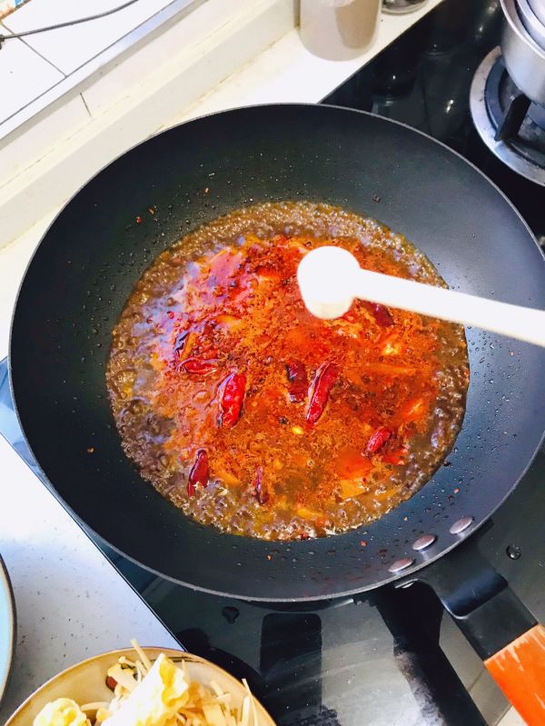 热锅凉油放入葱姜蒜炒出香味 放入干红椒和花椒炒山香味 放入郫县豆瓣和辣椒粉炒出香味